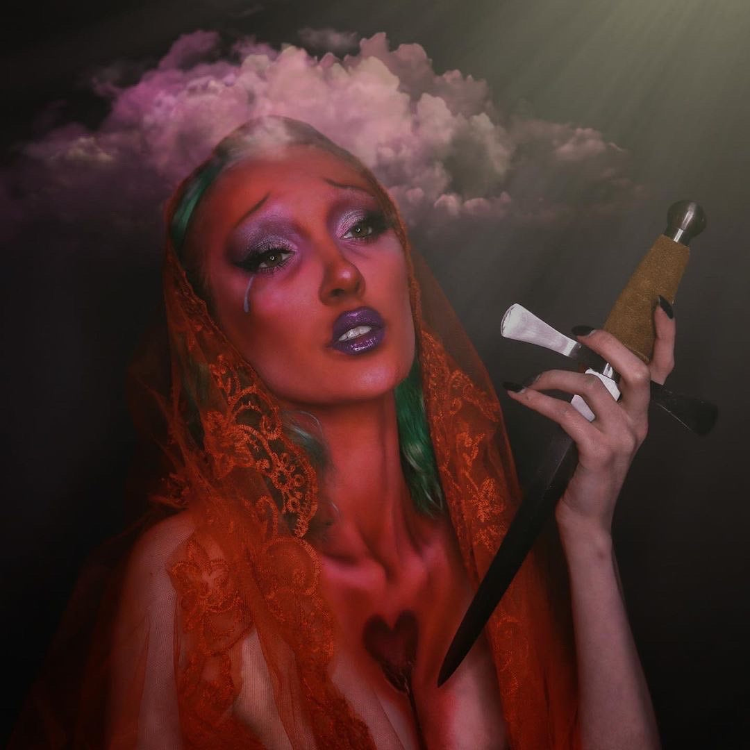 A gorgeous one layer, sheer red veil with a floral appliqued edge.