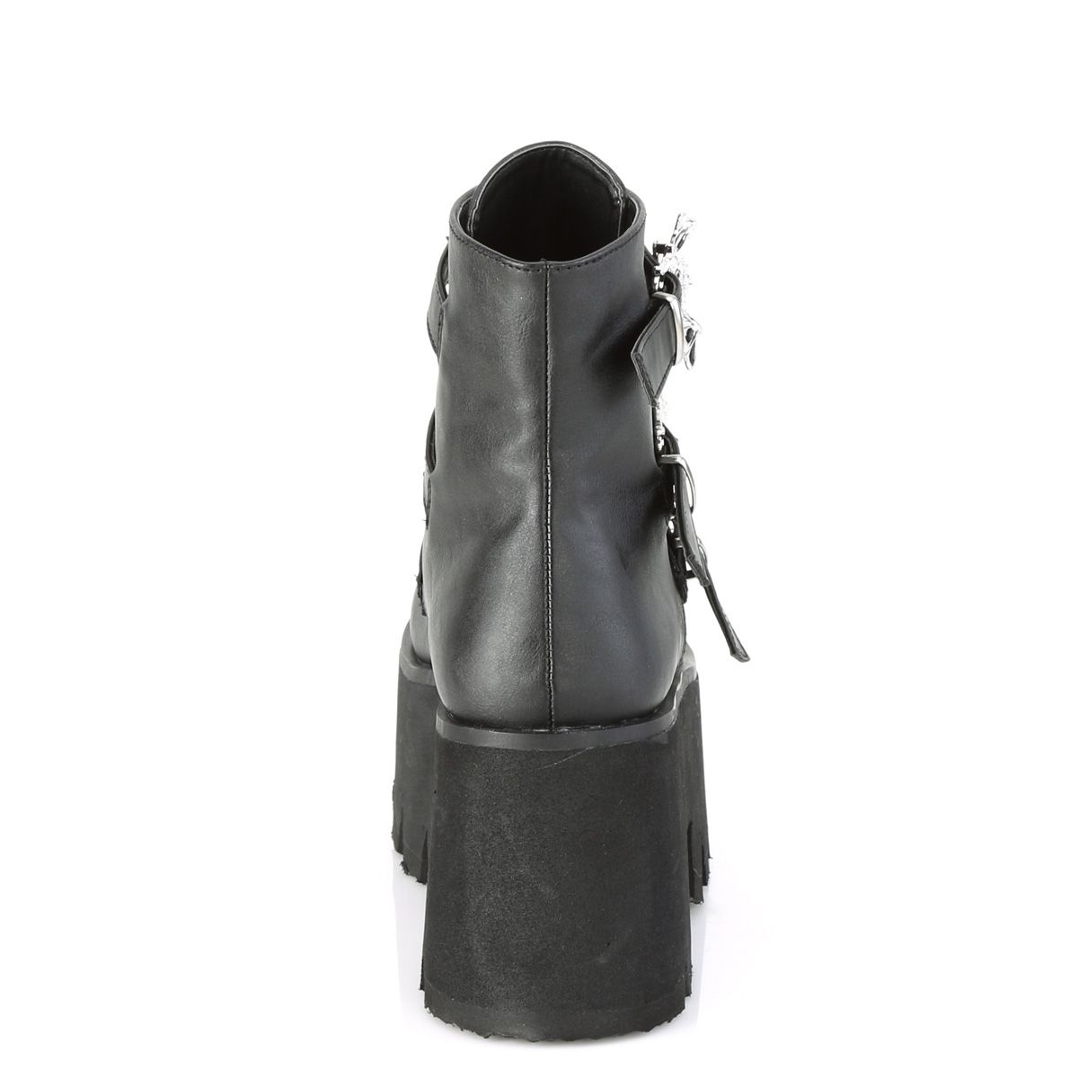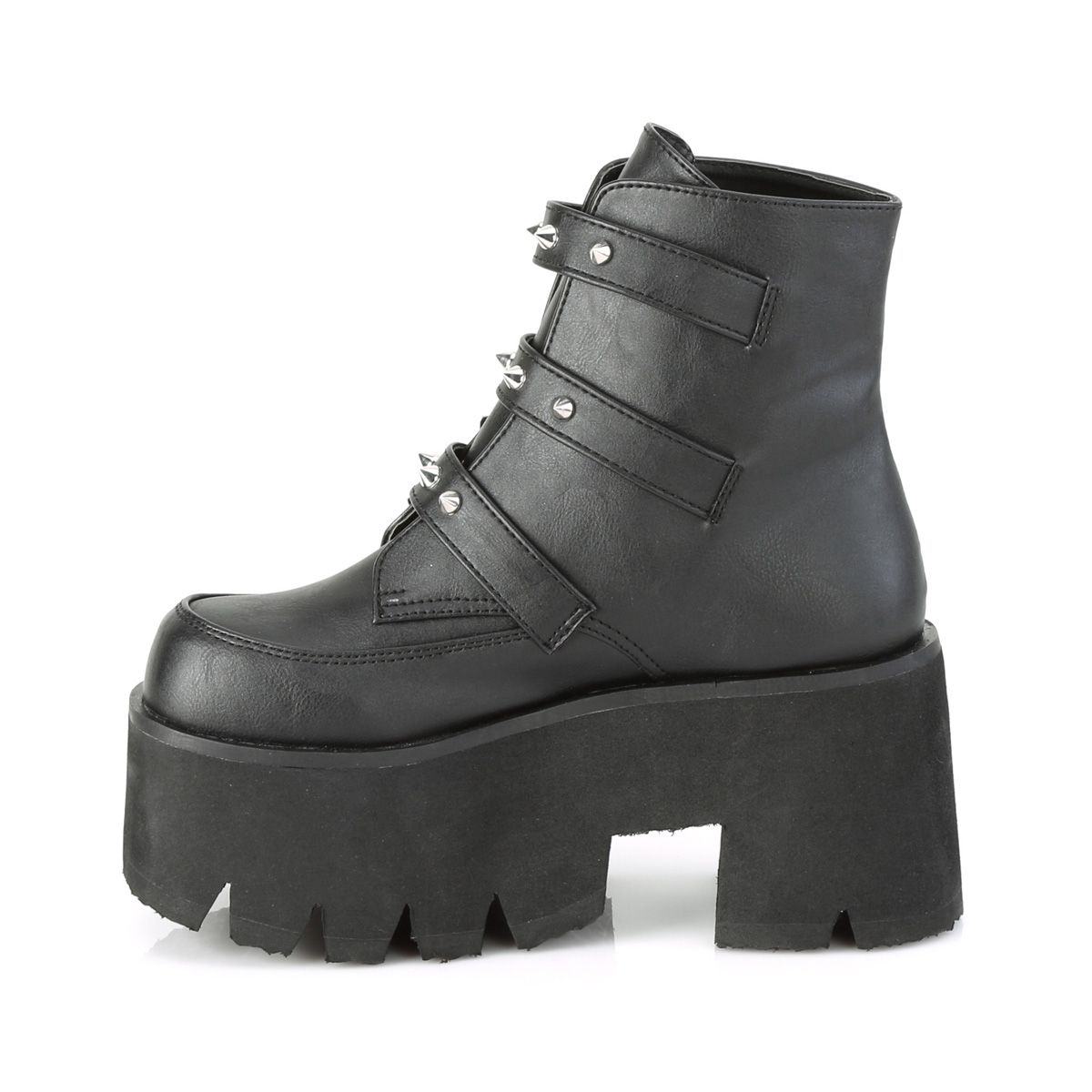 A trio of studded straps complete with killer bat buckles, on a cool and comfy big platform ankle boot.